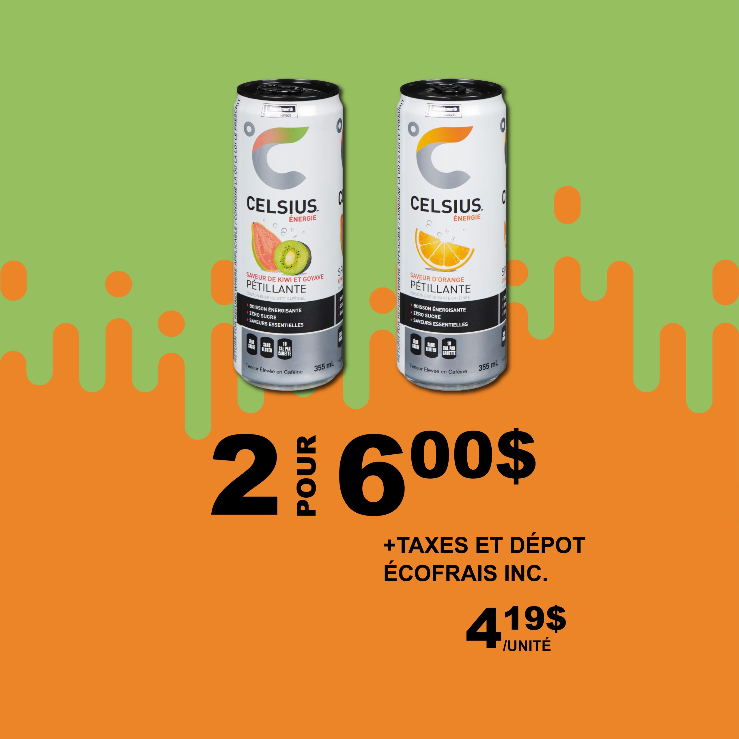 Achetez 2 boissons énergisantes Celcius, saveurs variées de 355 ml pour 6,00$ (+tx et dépôt écofrais inclus). Prix unitaire : 4.19$ 0.845$/100 ml Du 28 janvier 2026 au 12 mai 2026.