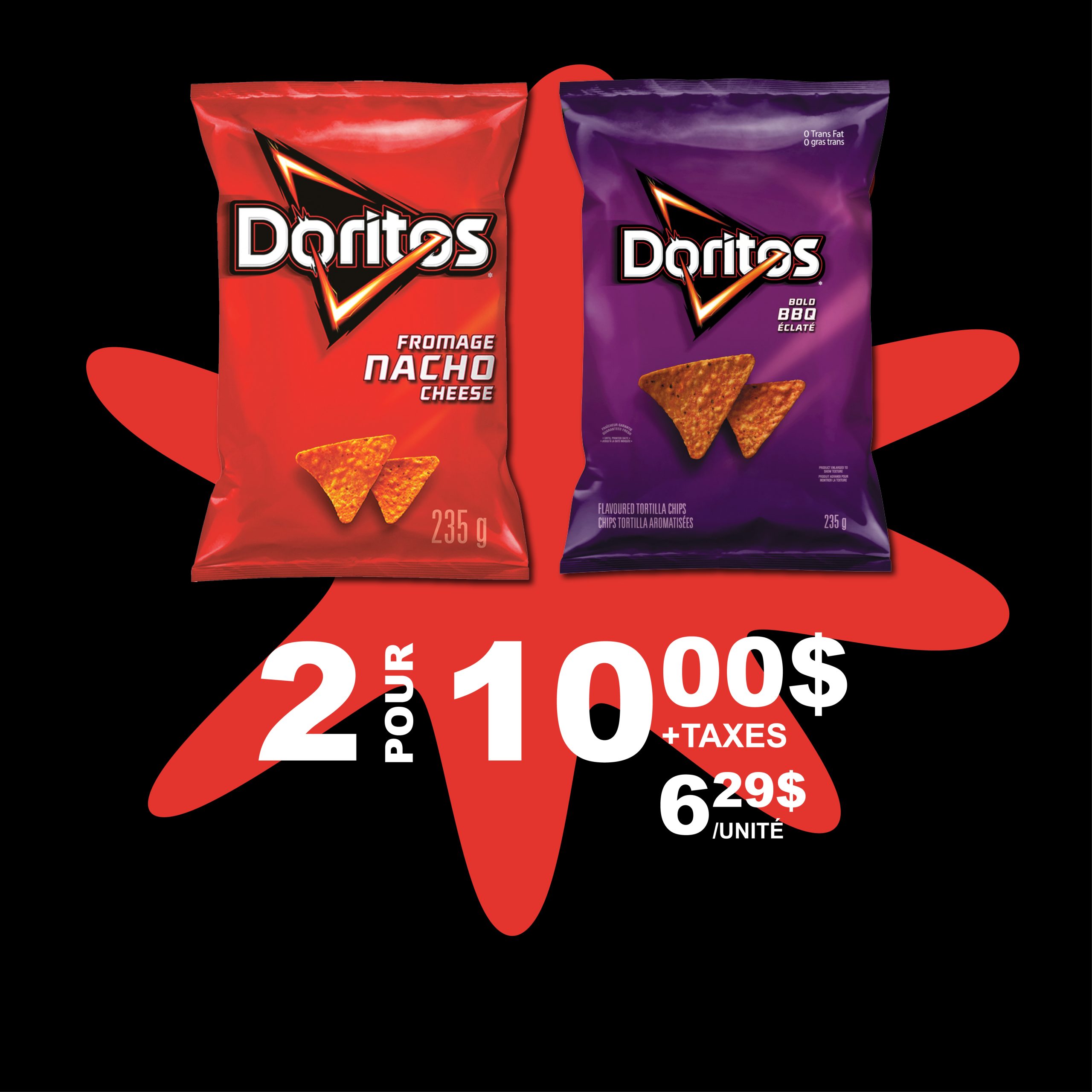 Achetez 2 sacs de croustilles de tortillas Doritos, saveurs variées de 210 g à 235 g pour 10,00$ (+tx). Prix unitaire : 6.29$ 2.128$ à 2.381/100 g Du 28 janvier 2026 au 12 mai 2026.