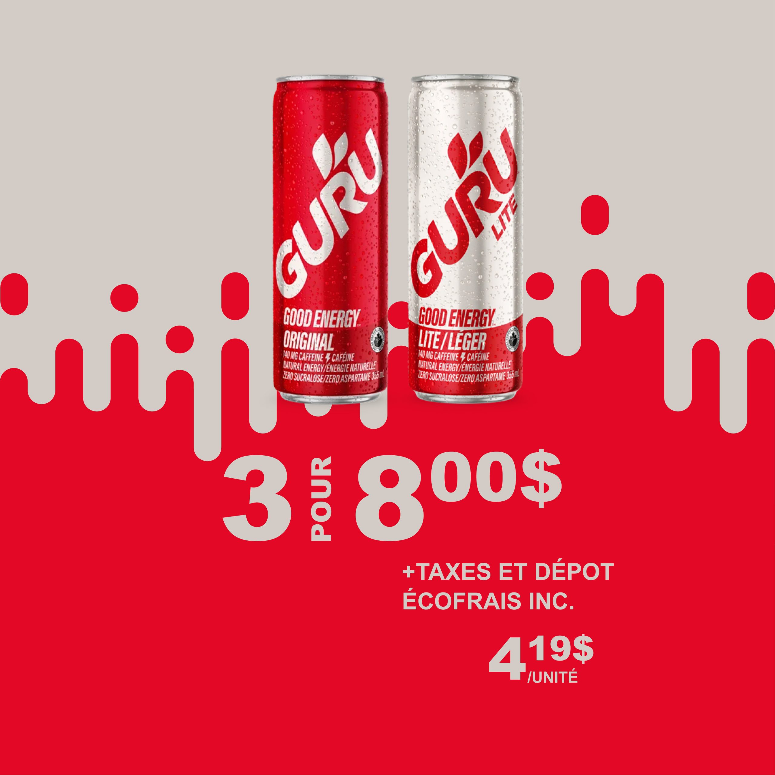 Achetez 3 boissons énergisantes Guru, saveurs variées, 355 ml pour 8,00$ (+tx et dépôt écofrais inclus). Prix unitaire : 4.19$ 0.751$/100 ml Du 28 janvier 2026 au 12 mai 2026.