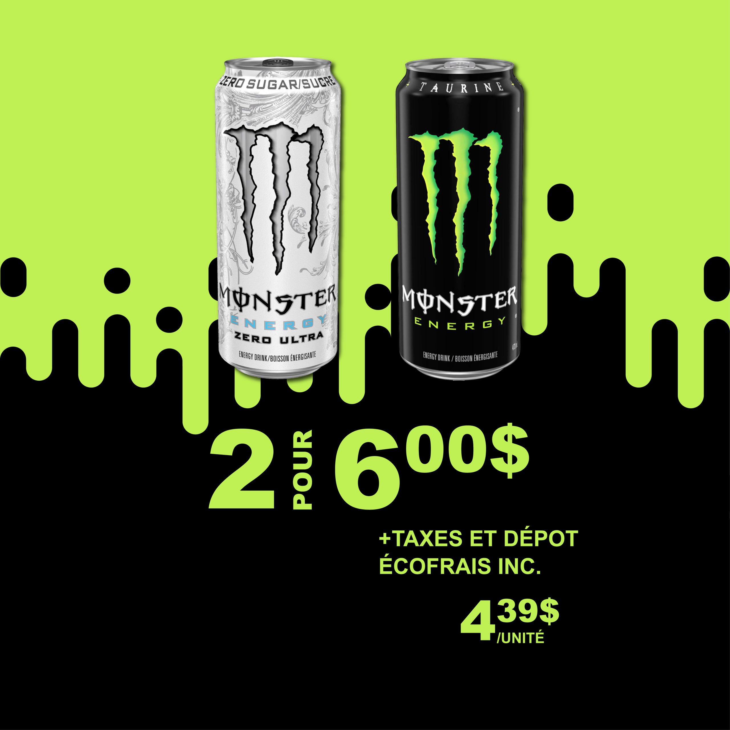 Achetez 2 boissons énergisantes Monster ou Rehab, saveurs variées, 458 ml à 473 ml pour 6,00$ (+tx et dépôt écofrais inclus). Prix unitaire : 4.39$ De 0.634$ à 0.655 $/100 ml Du 28 janvier 2026 au 12 mai 2026.