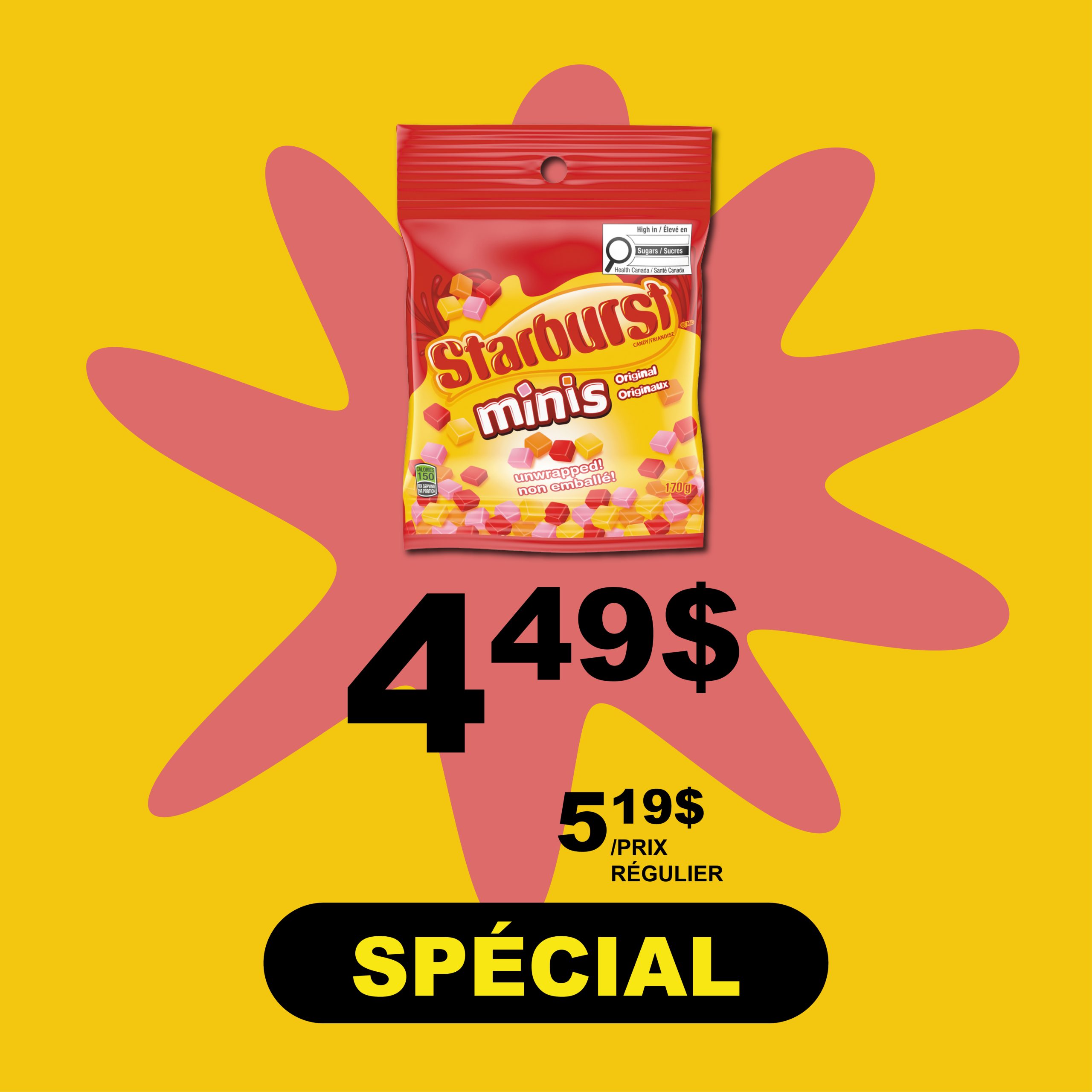 SPÉCIAL - Bonbons Starbust, Skittles, saveurs variées de 130 g à 170 g pour 4,49$ (+tx). Prix unitaire : 5,19$ (+tx). De 2.642$ à 3.454$/100 g Du 28 janvier 2026 au 12 mai 2026.