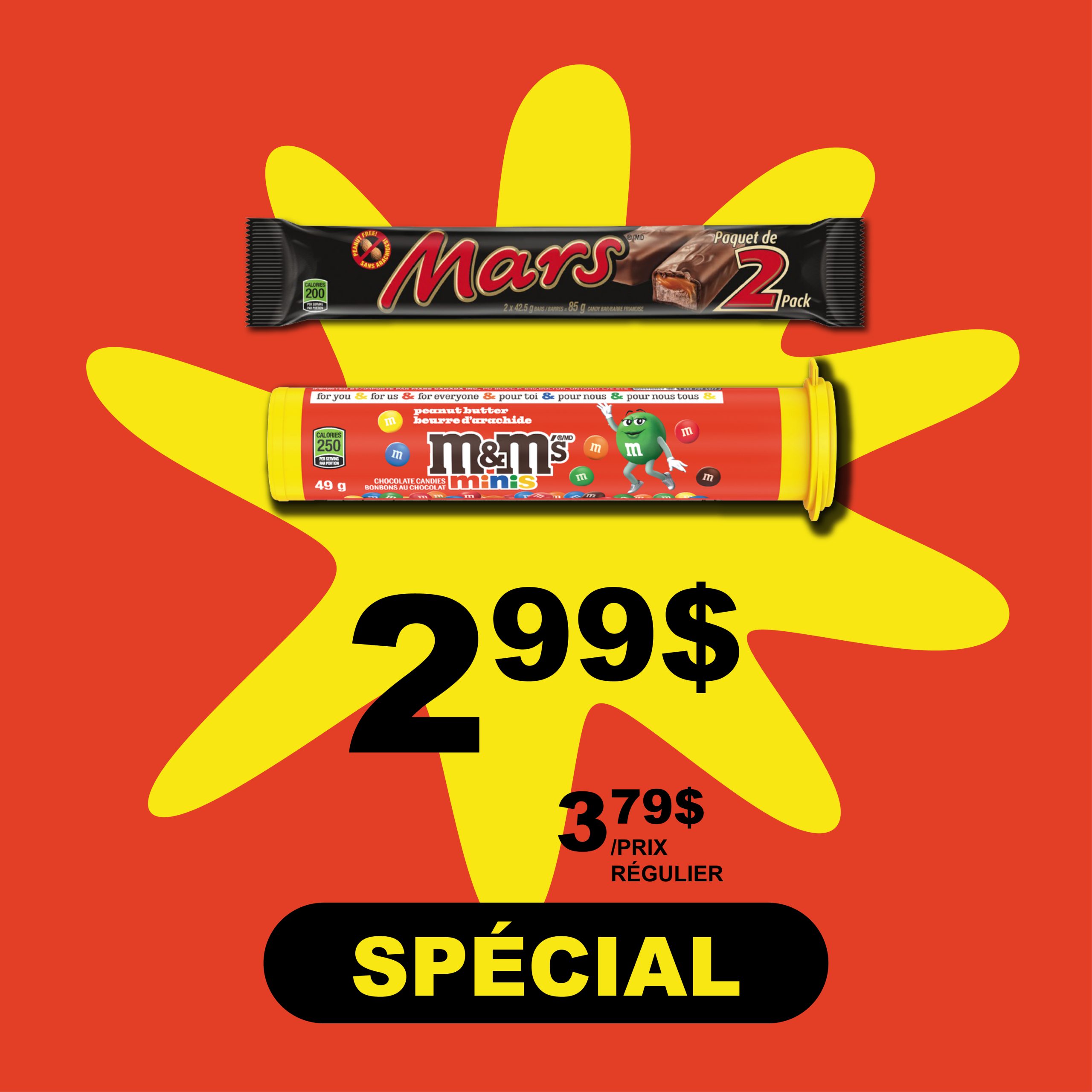 SPÉCIAL - tablettes de chocolat grand format, 49.3 g à 93 g, M&M Tube, Mars, Snikers, Twix pour 2,99$ (+tx). Prix unitaire : 3,79$ (+tx). De 3.215$ à 6.065$/100 g Du 28 janvier 2026 au 12 mai 2026.